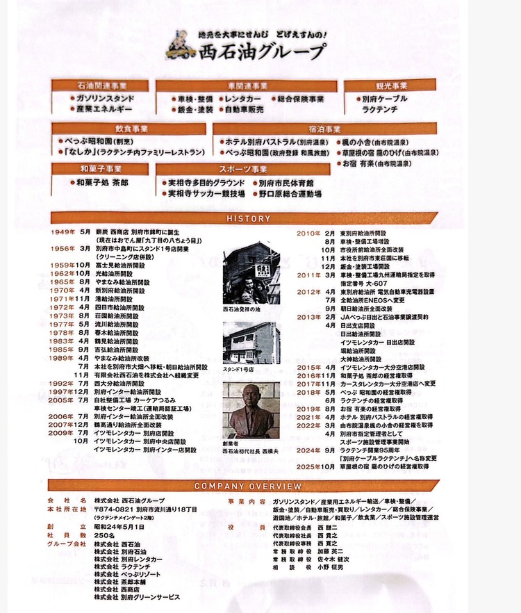 西石油集團創立於1949年,總部位於日本別府市,為九州地區具代表性的地方企業之一。公司以石油能源事業為基礎,逐步發展出涵蓋加油站營運、汽車維修與租賃、觀光娛樂、溫泉旅宿及餐飲服務等多元事業體,形成結合能源與生活服務的多角化經營模式。面對能源市場轉型與地方人口結構變化,西石油集團以「地域密着」為核心策略,持續深化在地服務與產業整合,為日本地方企業轉型的典型案例之一。