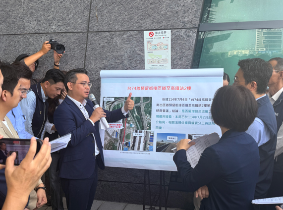 立法院交通委員會今日赴臺中實地考察多項交通建設,副院長江啟臣及多位立法委員出席,並承諾協助中央資源挹注,協力打造中臺灣便捷交通路網。黃副市長指出,高鐵臺中站為城市重要門戶,鄰近台74線、國道1號及國道3號,捷運綠線亦匯集於此,人口與車流日益增加,道路容量與設施負荷持續升高。市府期盼中央支持經費補助,改善交通瓶頸並提升道路運輸效率。