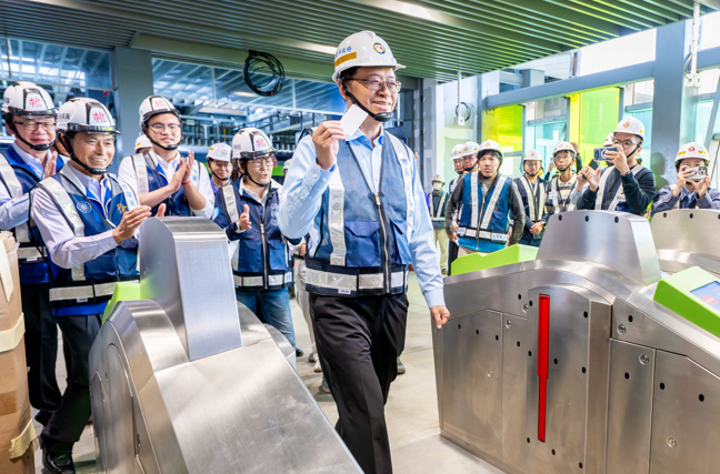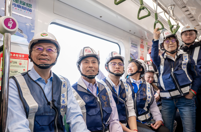 張市長親自搭乘測試列車,表示捷運沿線景觀優美,尤其橫跨南崁溪的蝴蝶橋造型獨特,列車行駛時與高鐵交錯,形成捷運在上、高鐵在下的特殊景象。他指出,雖然車站尚未全面完工,但主體結構已完成,對北段7站明年底通車充滿信心。