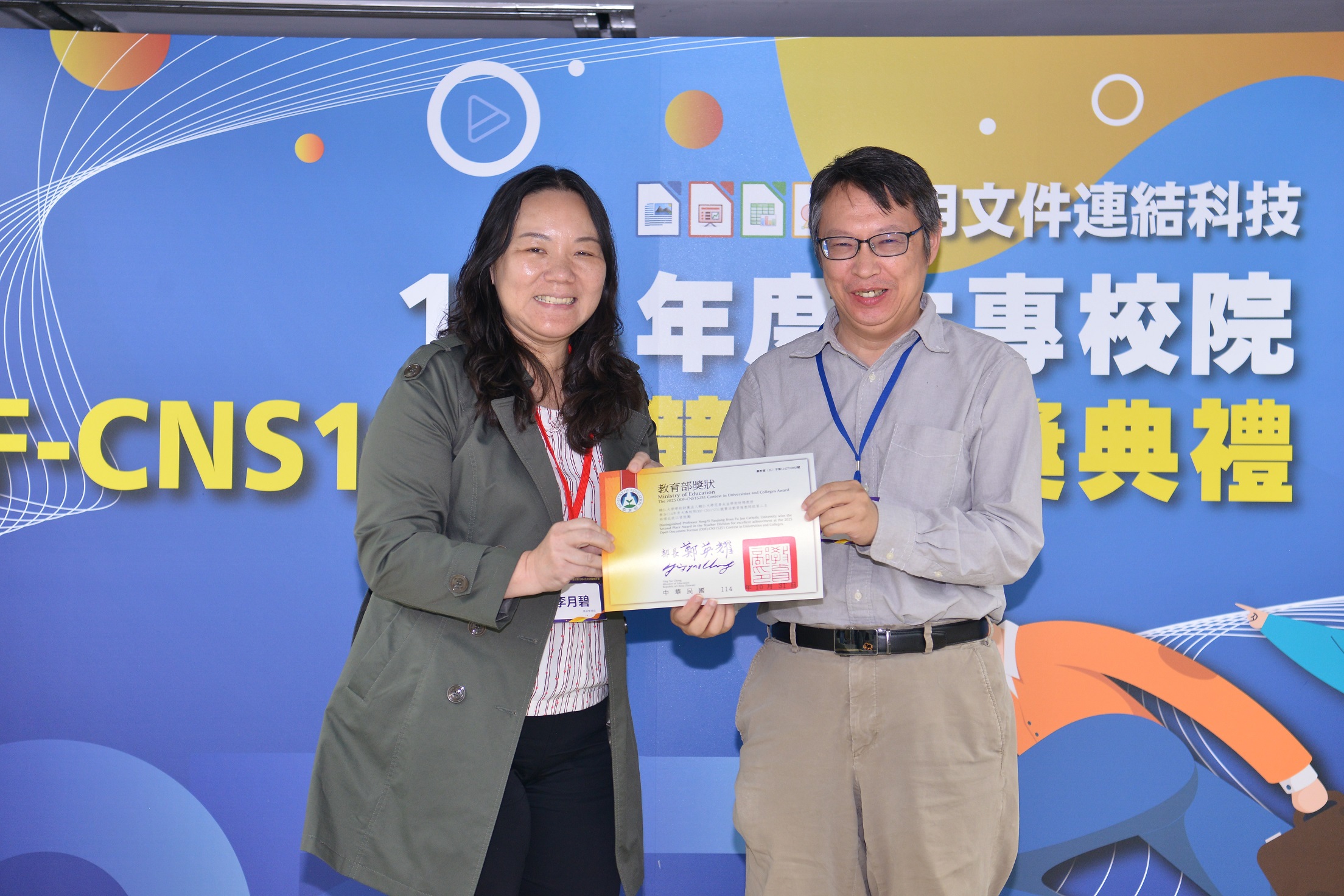 教育部為推動開放文件格式(ODF)應用,並促進軟體平權紮根校園,今年辦理的「114年度大專校院ODF-CNS15251競賽」已正式揭曉競賽結果。活動鼓勵教師運用ODF格式製作教材,並引導學生以ODF格式提交作業,藉此提升大專校院師生對開放文件格式的熟悉度與應用能力。