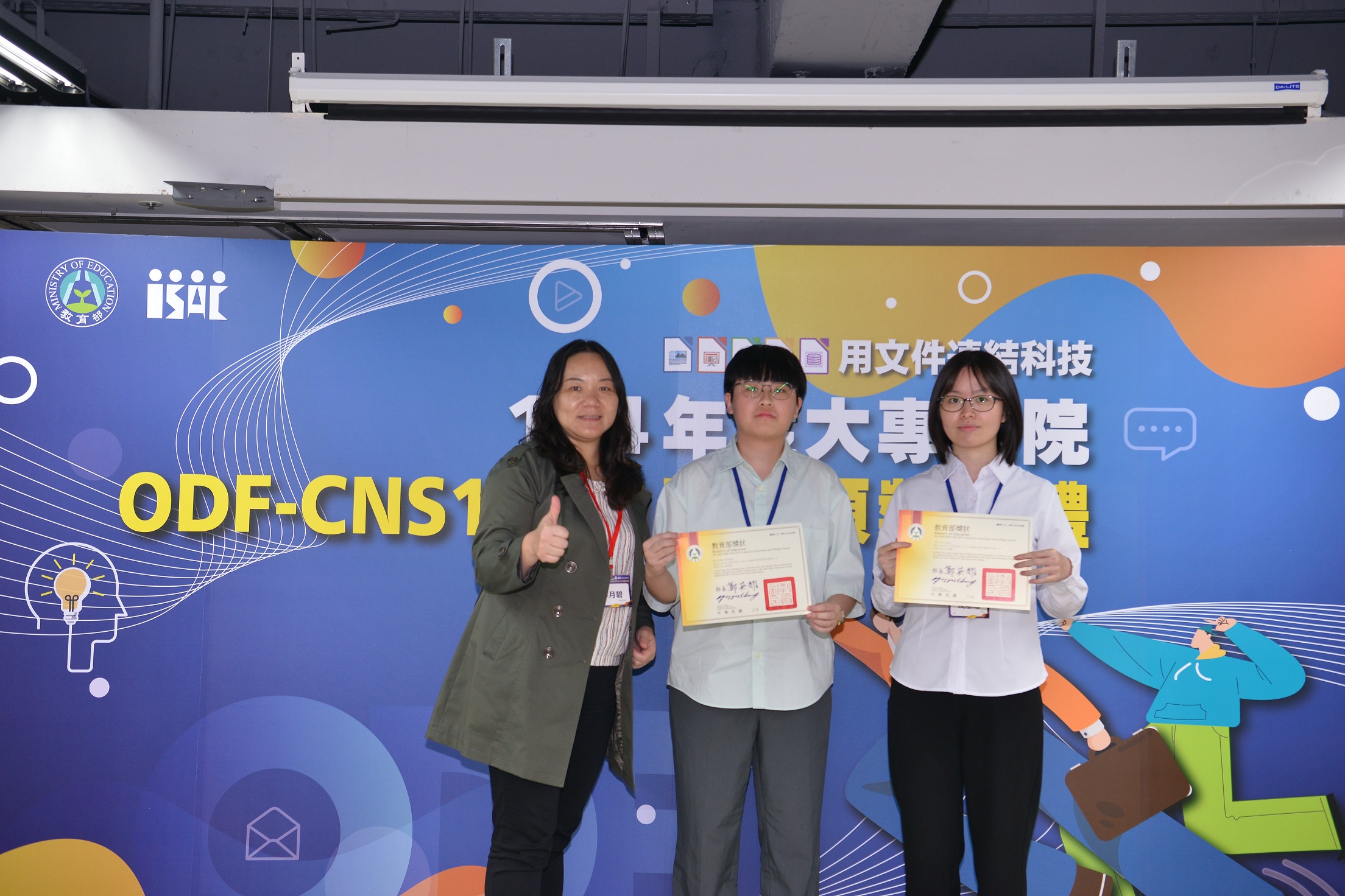 學生組方面,第2名由國立宜蘭大學鄧雅云同學與中原大學沈郁珊同學獲得,第1及第3名空缺。教育部頒發獎狀及獎金,以肯定教師及學生對ODF應用的努力與創意。