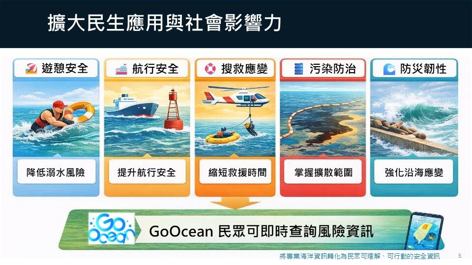 未來系統將廣泛應用於海上搜救、污染防治、航行安全、遊憩管理及防災應變等五大場景,可即時提供動態預測與風險評估,有助縮短救援時間並提升決策精準度。