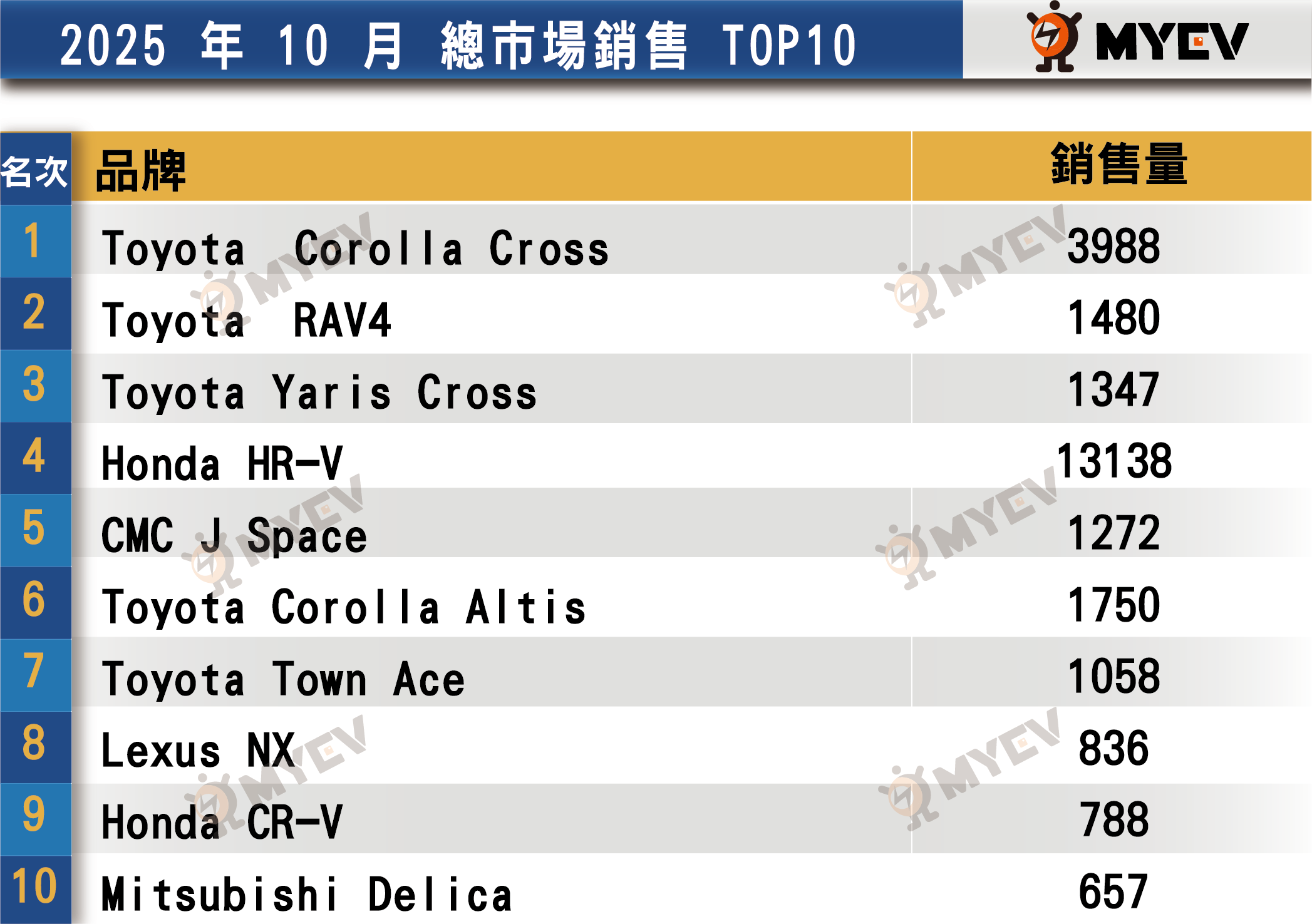 國產車市場方面,Toyota 依舊穩居銷售冠軍,主力車款 Corolla Cross 與 Altis 銷售維持高檔,持續拉抬整體國產車市場表現。