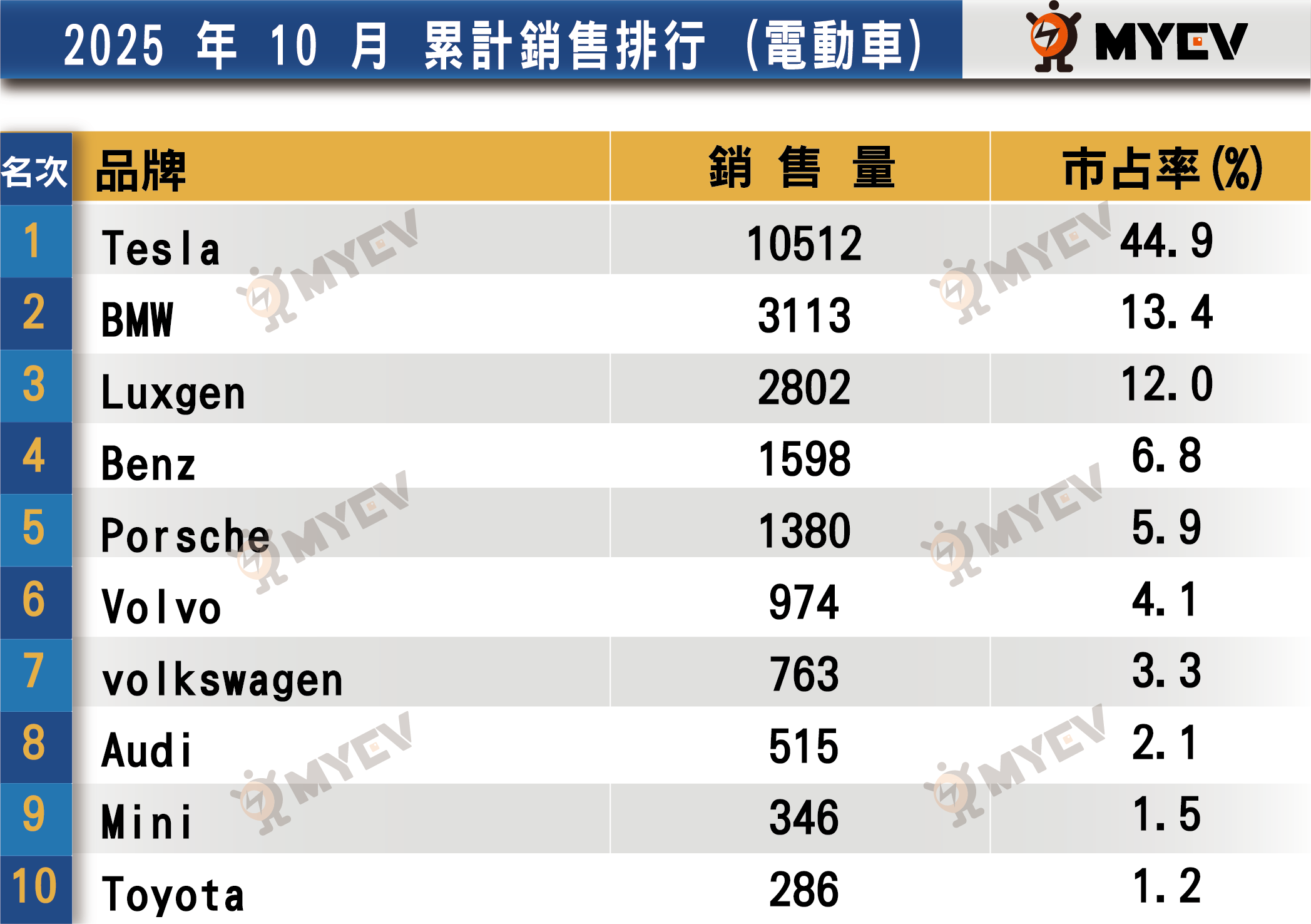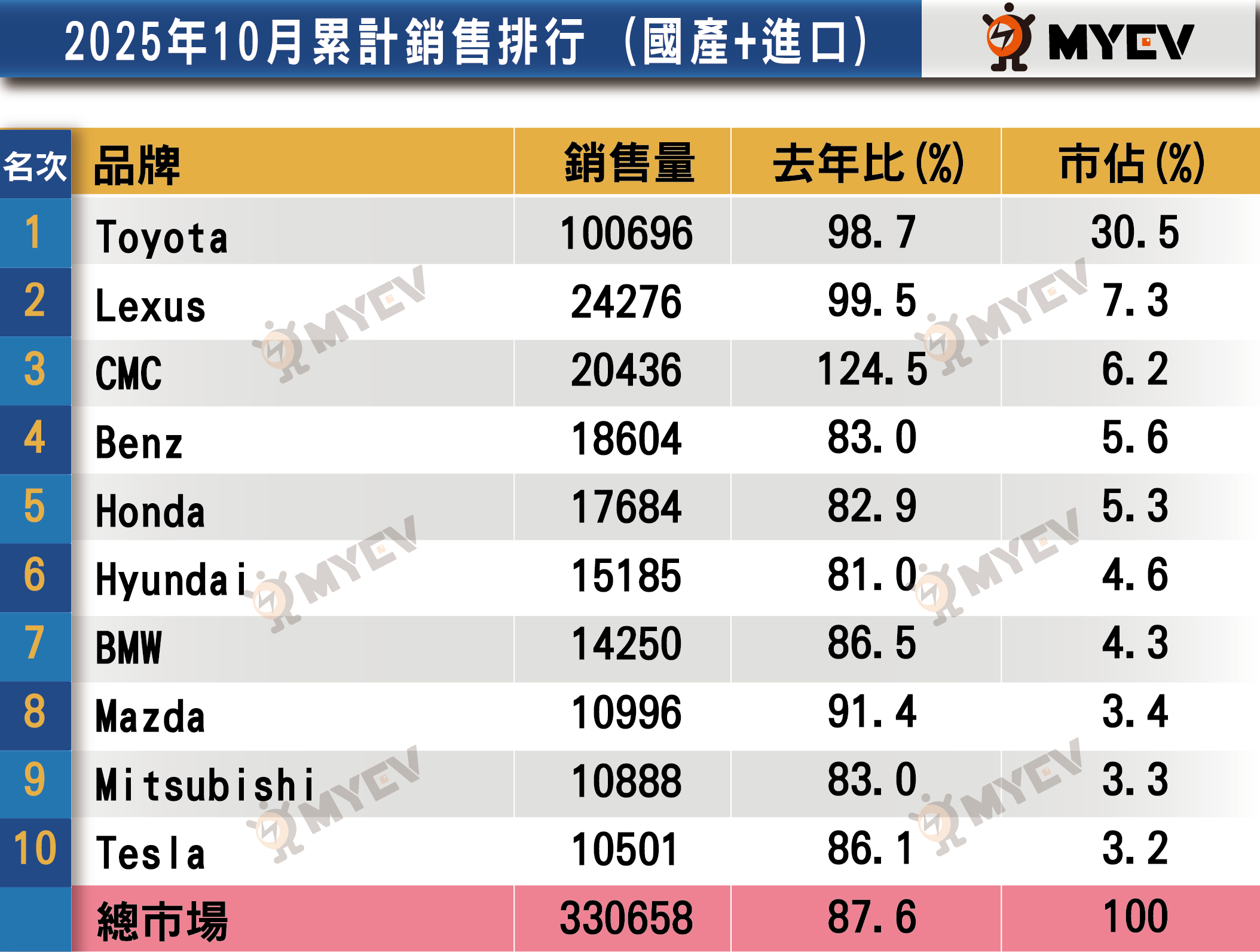 雖然Tesla因船期影響,10月掛牌僅 21輛,遠低於9月的2,491輛,但其他品牌的穩定表現成功撐起整體市場,使總銷售量依然維持正成長。