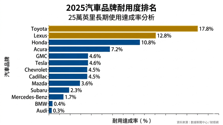 相較之下,德系豪華品牌的長期耐用表現則明顯偏低。BMW與Audi分別僅有0.4%與0.3%,Mercedes-Benz則為1.7%,顯示高性能與高科技導向的車款,在長期使用穩定性方面並未取得同等優勢。