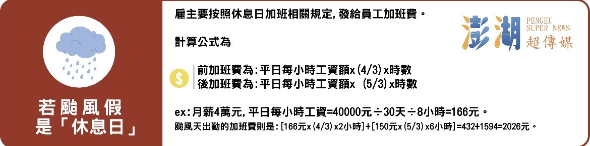澎湖超傳媒/記者邵寈 因應颱風季節來臨,為保障民眾及勞工安全,勞動部提醒,依據《天然災害停止辦公及上課作業辦法》第四條規定,當颱風暴風半徑預計在四小時內經過,且平均風力達七級以上,或陣風達十級以上時,相關地區即可停止上班及上課。惟實際是否放假,仍由各縣市政府首長視當地天候及災情狀況裁定,並非完全受限於氣象條件。