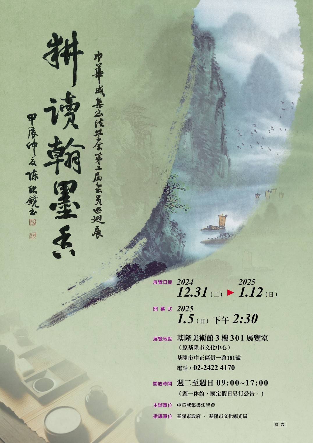 中華咸集書法學會第二屆會員書法聯展「耕讀翰墨香-共賞客家文化之美」將於12月31日(星期二)至明年1月12日(星期日)在基隆美術館三樓301展覽室舉行。本次展覽旨在透過書法藝術呈現客家文化的深厚底蘊與優雅魅力,歡迎市民及書法愛好者蒞臨參觀。