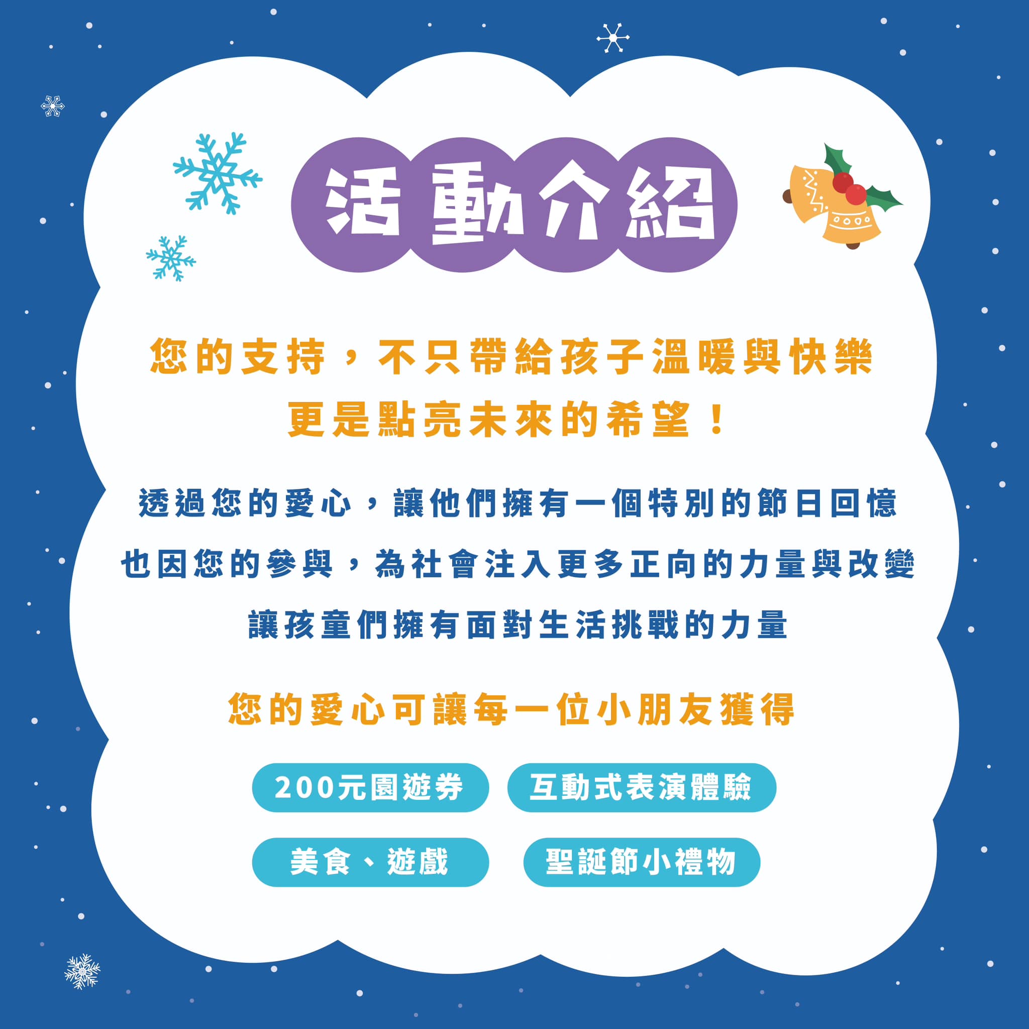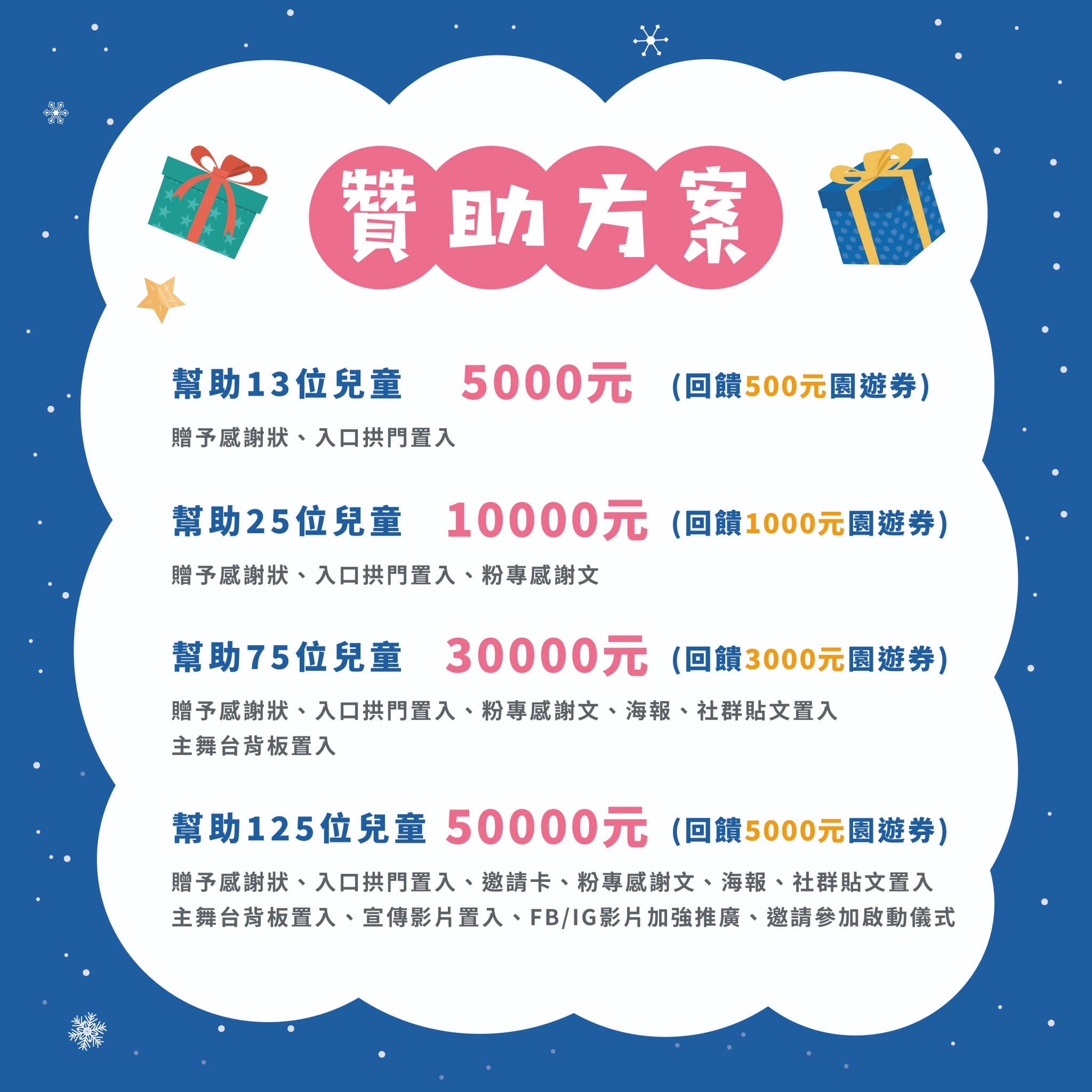 ● 捐款5萬元:幫助125位兒童,回饋5000元園遊券、海報、社群宣傳等