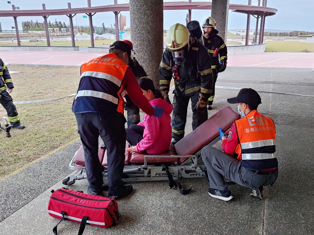 演練假設遊客中心一樓機房突發火災,現場煙霧彌漫,遊客因火勢驚慌而紛紛逃生。遊客中心工作人員立即撥打119報案並疏散現場人員,同時嘗試使用滅火器與室內消防栓滅火,但未能成功撲滅火源。接獲報案後,消防局迅速派遣西嶼分隊、白沙分隊及第二大隊趕赴現場。