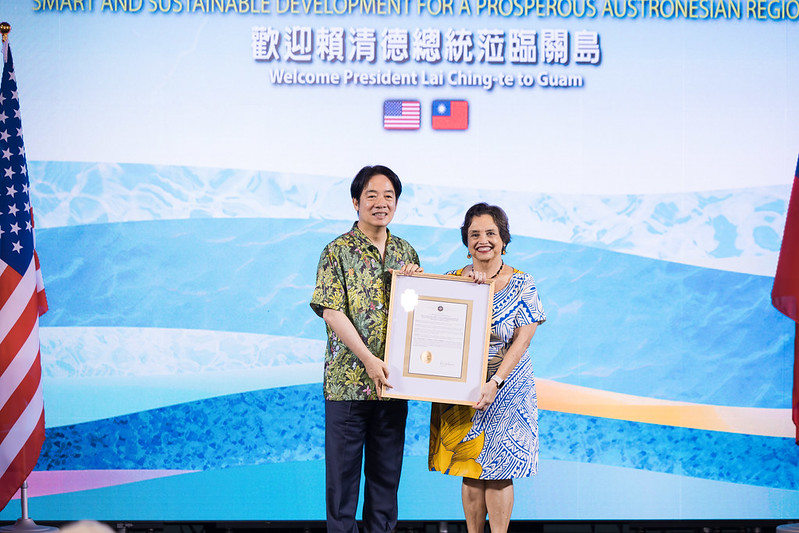 活動中,關島議會向賴總統贈送友好決議文,象徵臺灣與關島之間的堅定友誼。賴總統指出,這是關島議會連續四年通過相關決議,為兩地關係注入更多動力。他也期待未來推動更多雙邊交流與合作,共創雙方利益。
