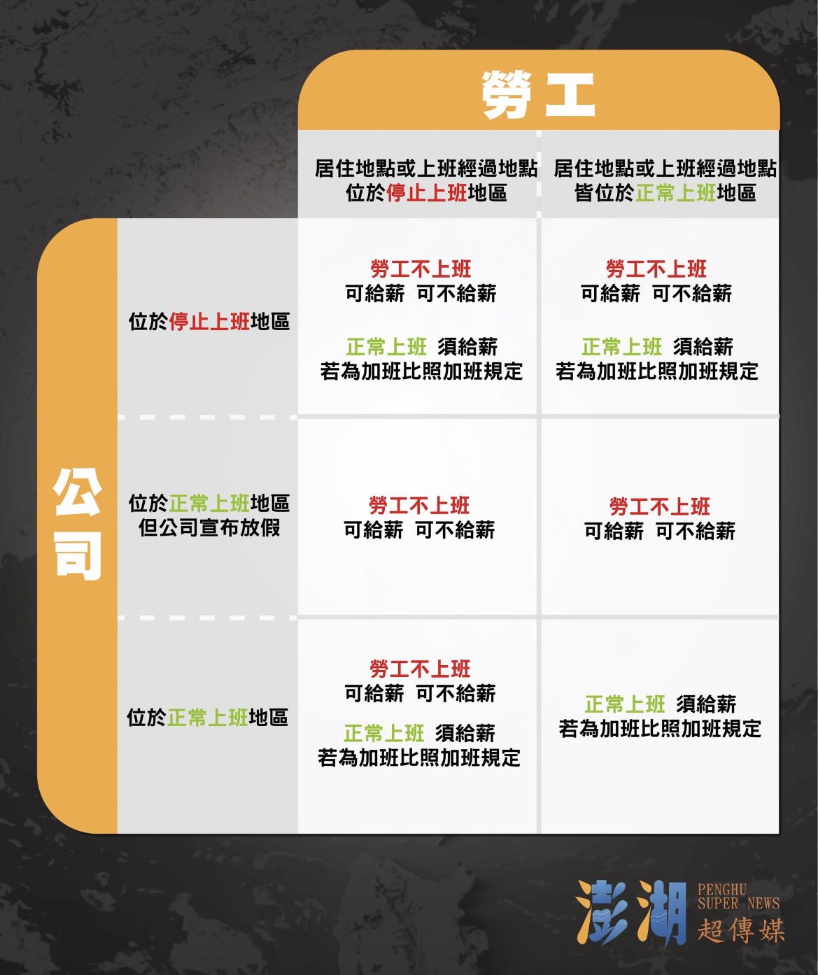 澎湖超傳媒/記者邵寈 因應颱風季節來臨,為保障民眾及勞工安全,勞動部提醒,依據《天然災害停止辦公及上課作業辦法》第四條規定,當颱風暴風半徑預計在四小時內經過,且平均風力達七級以上,或陣風達十級以上時,相關地區即可停止上班及上課。惟實際是否放假,仍由各縣市政府首長視當地天候及災情狀況裁定,並非完全受限於氣象條件。