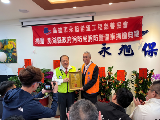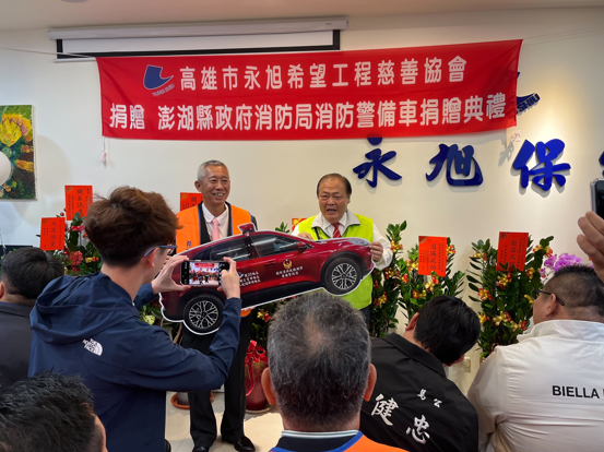 為加強澎湖縣離島及偏鄉的救災能力,高雄市永旭希望工程慈善協會於11月19日下午捐贈一輛消防警備車給澎湖縣消防局。捐贈典禮由澎湖縣長陳光復親自主持,並由慈善協會理事長呂文雄代表捐贈車輛圖卡。儀式上,縣長向慈善協會表示感謝,並回贈感謝狀與紀念品。